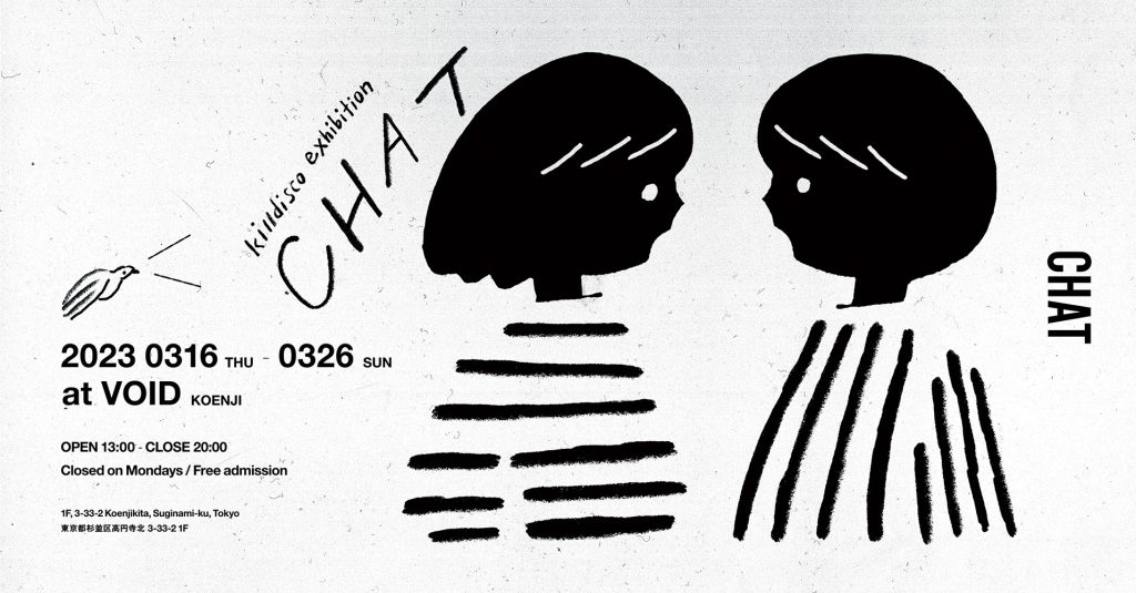 solo exhibition「chat」at 高円寺VOID 2023-03-162024-07-17 exhibition killdisco exhibition「CHAT」 at VOID 高円寺2023 03/16 木 – 3/26 日 月曜定休(会期による)入場無料東京都杉並区高円寺北3-33-2 1F